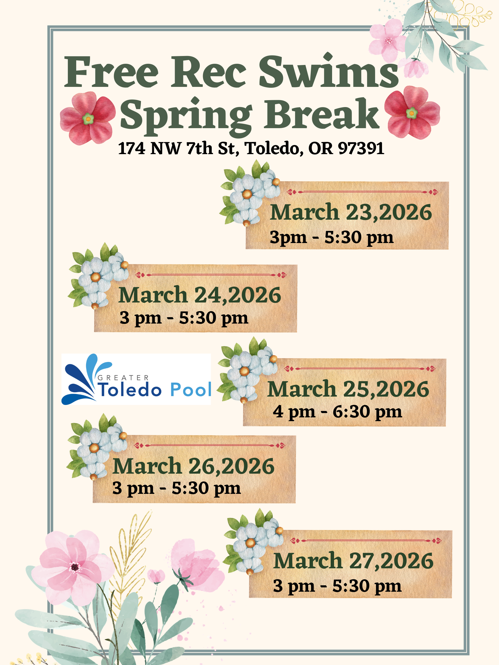 The next Board of Directors Regular Meeting will be held on April 13, 2026, at 6:00 p.m. in the Toledo Library meeting room, located at 173 NW 7th Street, Toledo, Oregon.