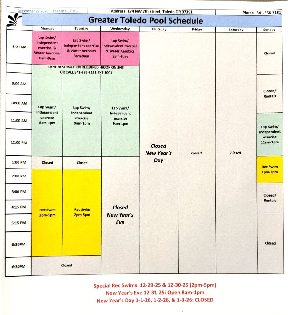 I hope everyone enjoyed Christmas and is ready to ring in 2026 this coming week!! There aren’t a lot of updates this week. Mainly we want you to know that the Pool schedule is quite different for the holiday weeks. The schedule is attached here and on Facebook and the website: www.greatertoledpool.org .