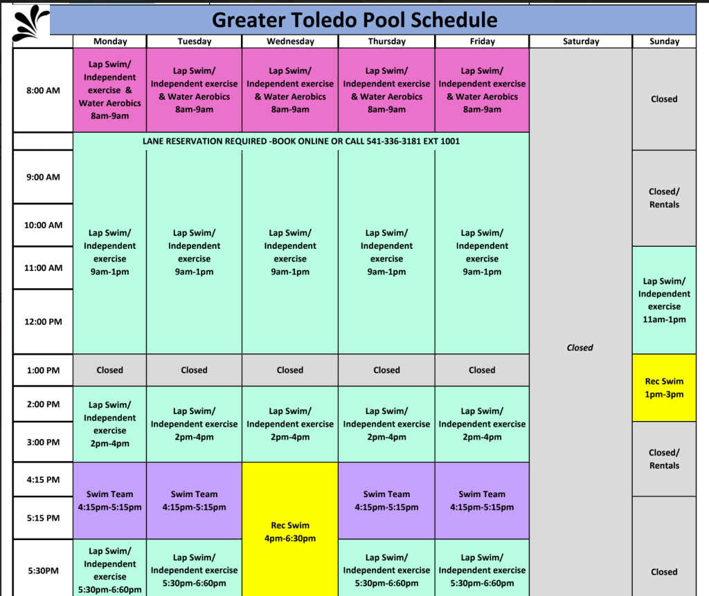 Greater Toledo Pool Patrons:December is quickly carrying us all towards the year-end Holidays. We hope you are enjoying the hustle and bustlethat this time of year brings. At the Pool we are busily getting ready for the “Santa Swim Party” on Tuesday the 23rd,and hope that you have it on your calendars! There are still lots of other times to come enjoy independent exercise or lap swimming, join the morning Water Aerobics class, or bring the kids or family to Rec Swim times on Wednesday or Sunday afternoons. This is YOUR pool … come and take advantage of it!!