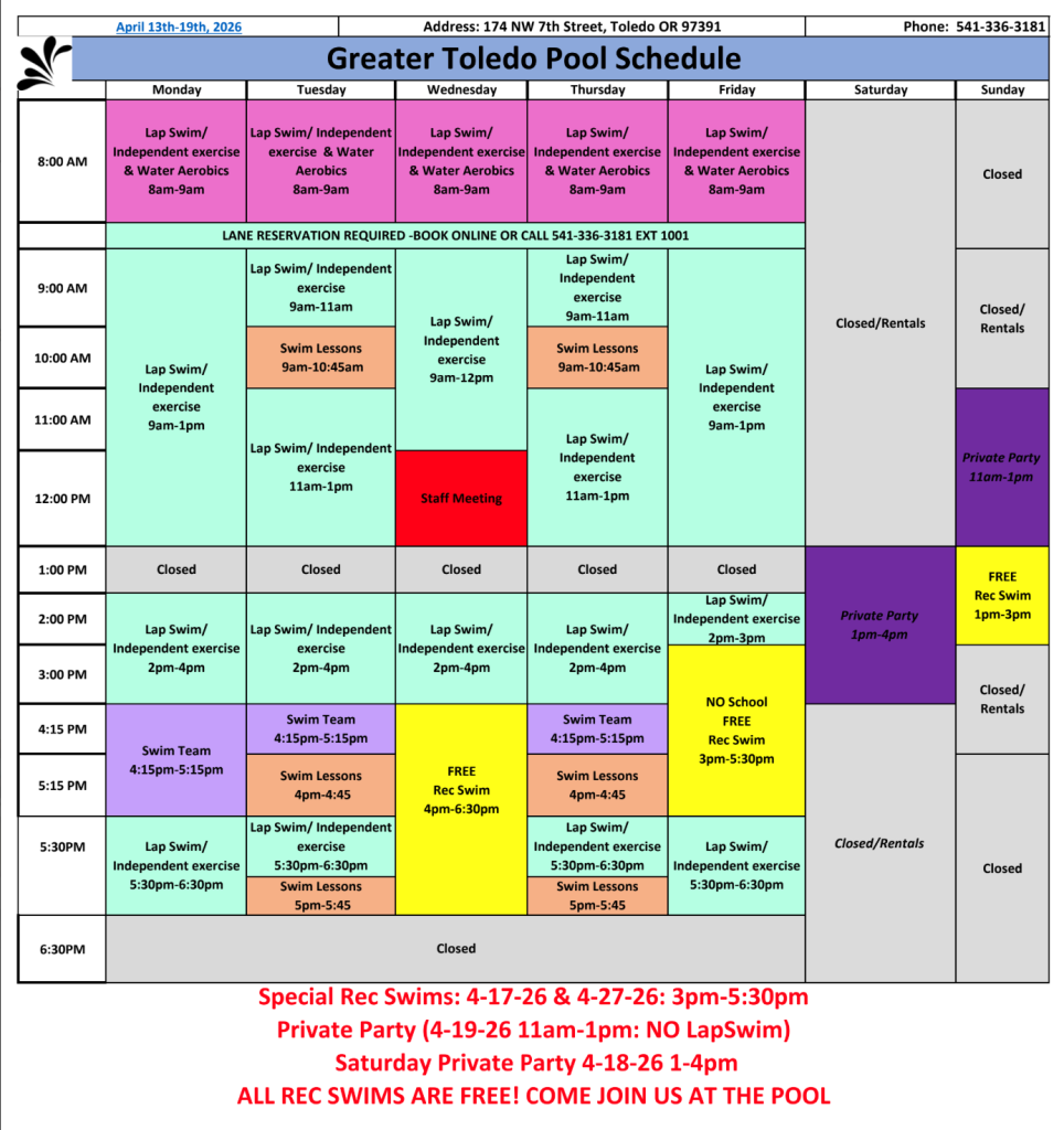 Mark you calendars and plan on coming the enjoy some time at the Pool for FREE!! Check out the Schedule below. Hope to see you at the pool soon!!
