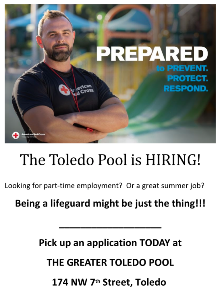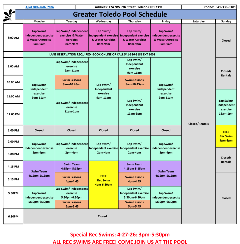 The regular Meeting of the Greater Toledo Pool Recreation District’s Board of Directors was moved from its regularly scheduled time last Monday, to this coming Monday — April 20, 2026.