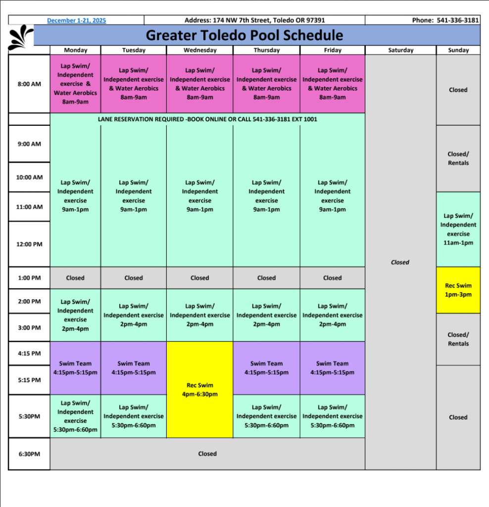 We will post the schedules for those weeks here in the newsletter and on FACEBOOK and our website: greatertoledopool.org