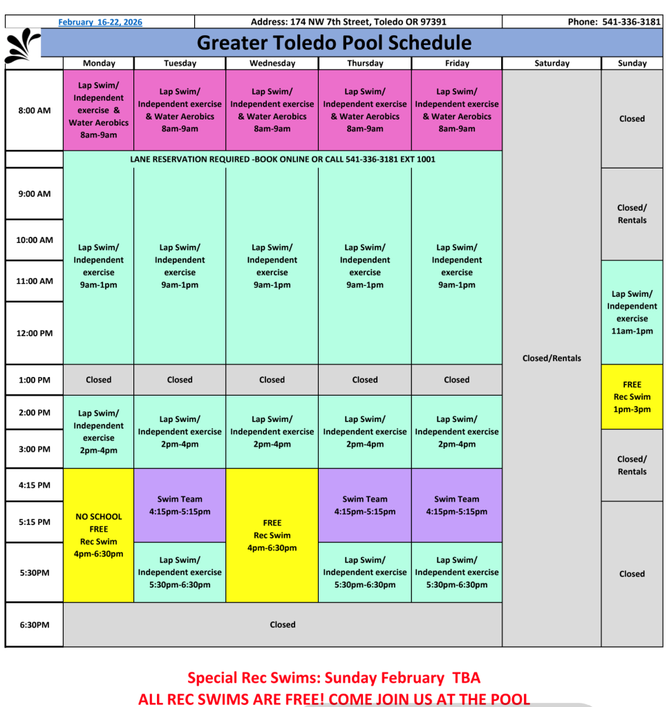 We were hoping to offer Swim Lessons after the Holiday to Toledo Elementary (TOES), but the staff and students aren’t quite ready yet.  Hopefully we will be offering classes to TOES sometime after  Spring Break.  So in the interim we want to offer Swim Lessons open to the Public and see if there is enough interest to form classes for a variety of ages.    Lessons will run from February 14th – through March 19th … ending just before Spring Break for LCSD schools.