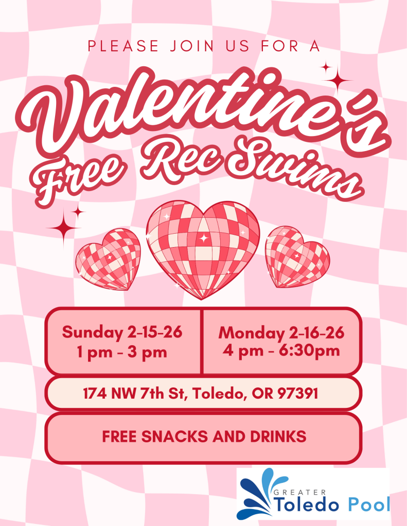 Here is is Valentines’ Day weekend already!!  In celebration of this cultural holiday we are sponsoring  FREE Rec Swim times both Sunday and Monday