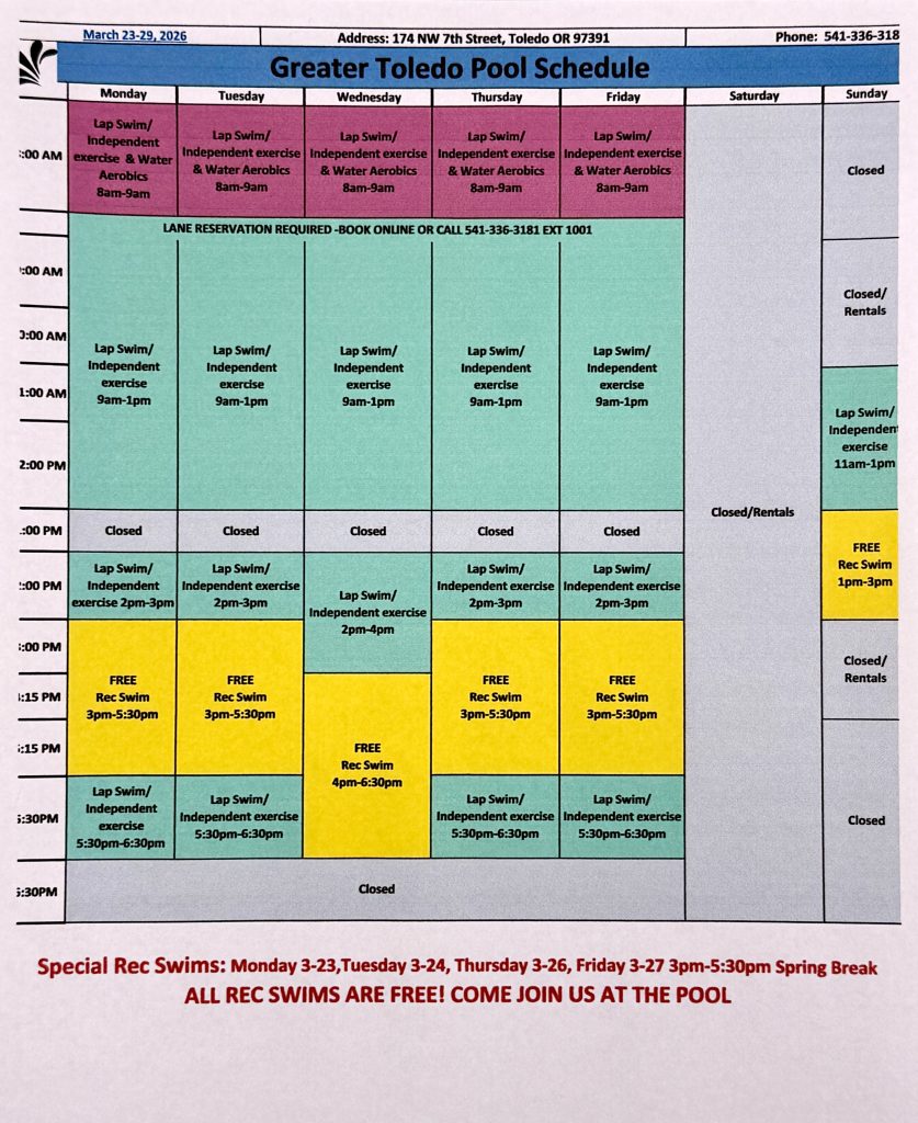 Since it’s Spring Break next week, we will be having FREE Rec Swim times every afternoon so kids and families can come enjoy the Pool as part of Spring Break!