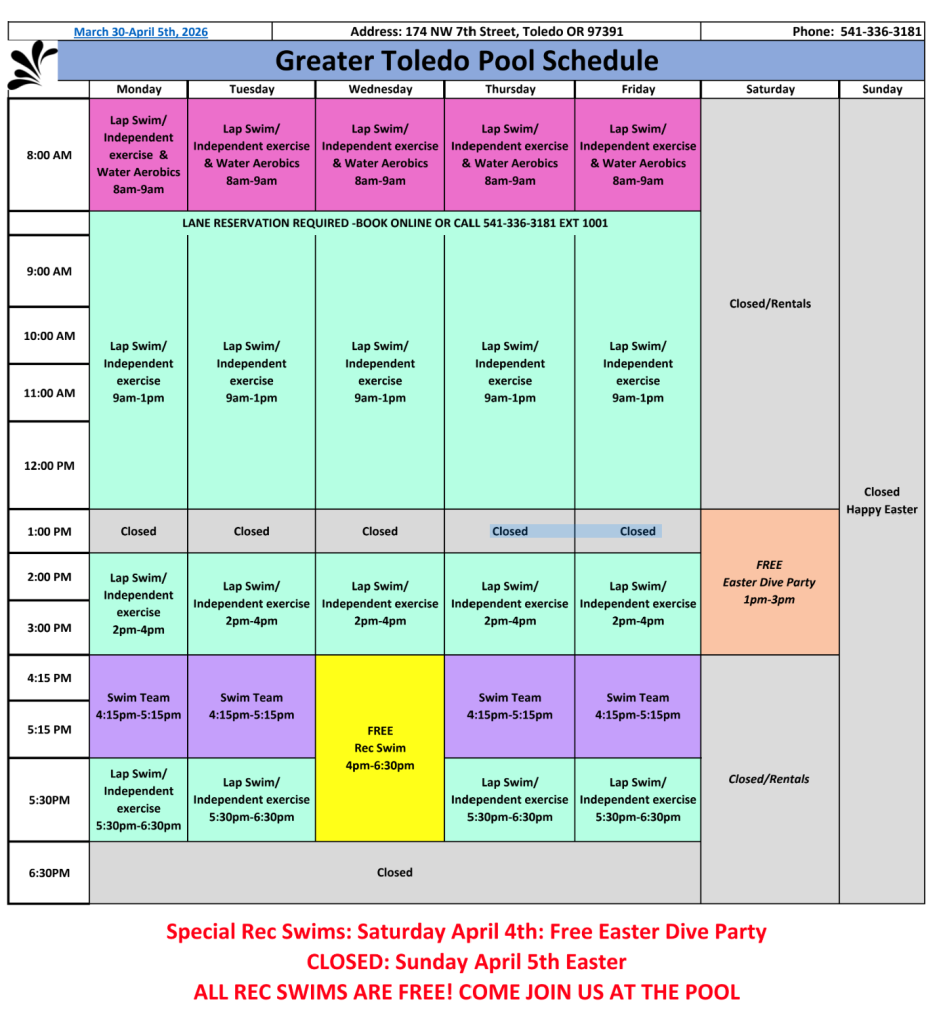 Next weekend is Easter and there are some fun things planned! The Toledo Library will be doing an Easter Egg Hunt on the lawn East of the Library on Saturday April 4th from 2:00 -3:00 p.m. (See the attached flyer.) And the Pool will be doing another FREE event that same day — April 4th — from 1:00 – 3:00 pm.We are calling it our EGG DIVE PARTY!! We will have games on the deck, an “Egg Dive” for various prizes, FREE swimming plus treats and beverages!!