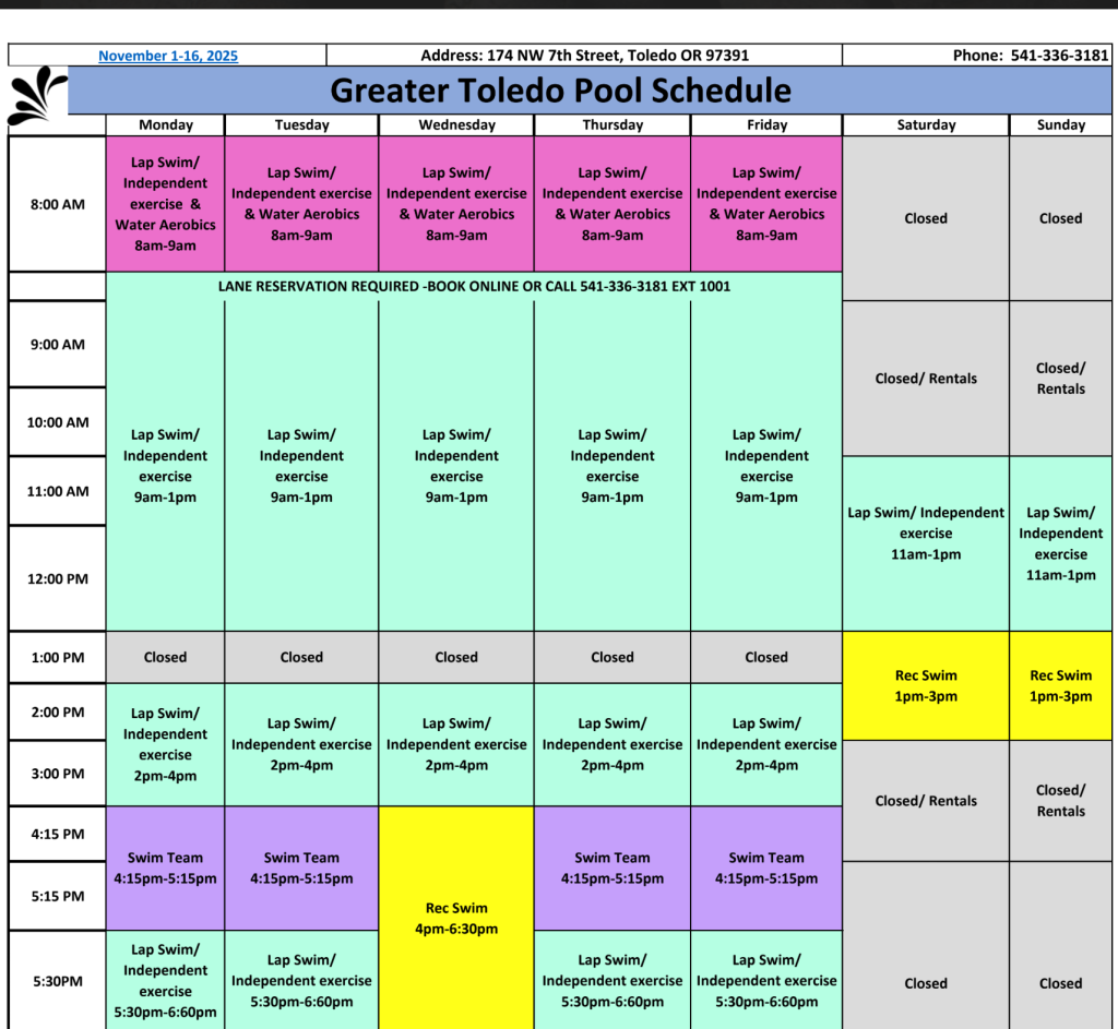 The Board of Directors for the Greater Toledo Pool Recreation District will hold their regular monthly meeting on Monday November 10, 2025, at the Toledo Public Library