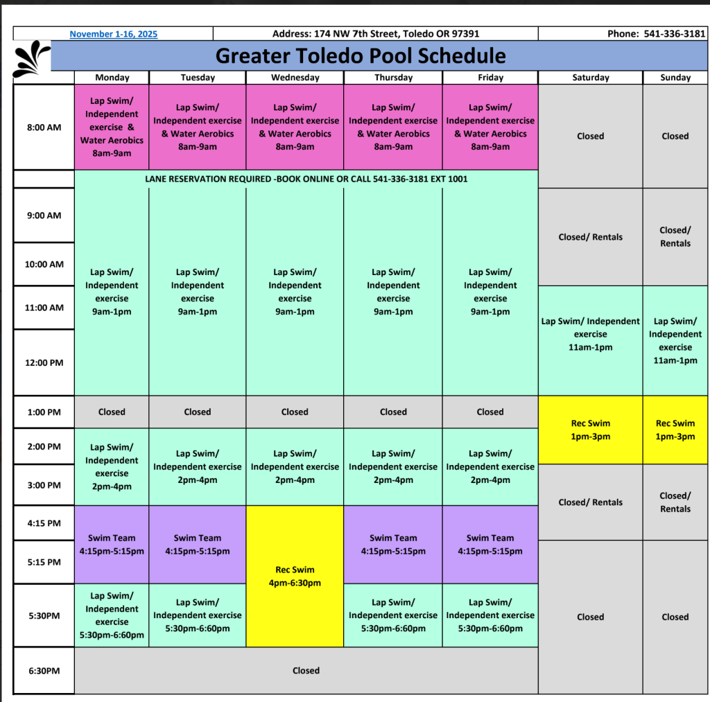 Things have CHANGED!!! The schedule for the first two weeks of November is attached. Our plan to provide Swim Lessons for TOES students has been delayed by 2 weeks — the teachers and students needed some additional time to get every detail in order. It takes a LOT for the teachers, staff and bus drivers to incorporate the Swim Lessons into any already full daily schedule. And it takes a lot for our STAFF here at the pool to re-arrange shifts and schedules to make it work. The plan as it stands now is to begin lessons during the week of November 17th. It’s absolutely a TEAM EFFORT to make this all work out … but we love to make it happen and look forward to getting the lessons going the two weeks prior to Thanksgiving, and on into December!